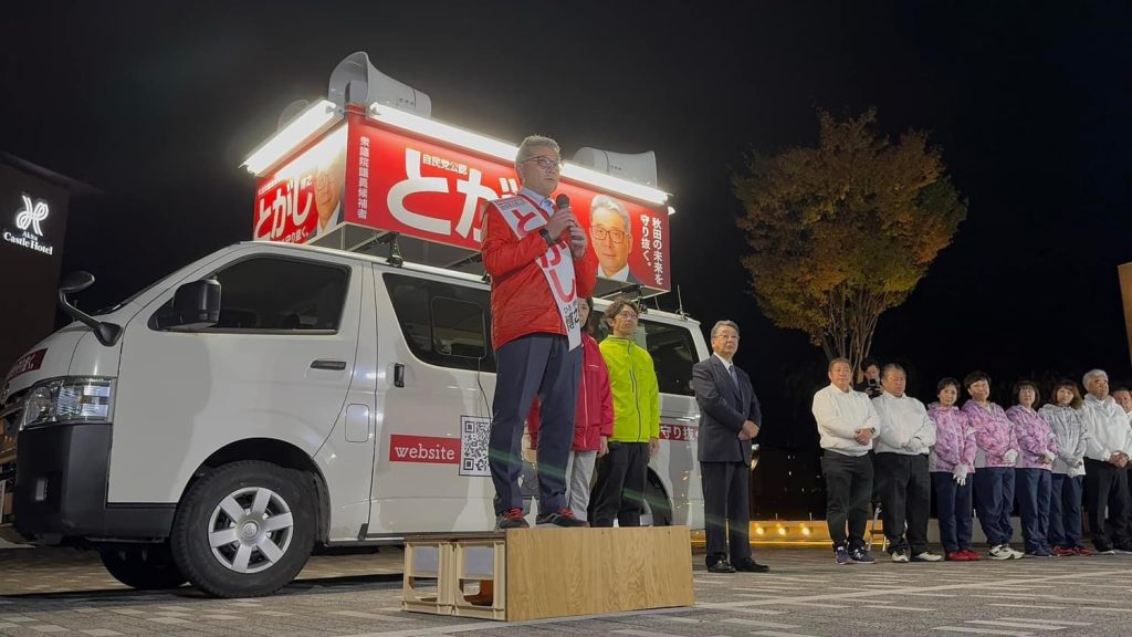 この厳しい戦いを何としても勝たなければいけない、その思いで、選挙カーに乗ってくれた仲間と共に、秋田市内を遊説してまいりました。