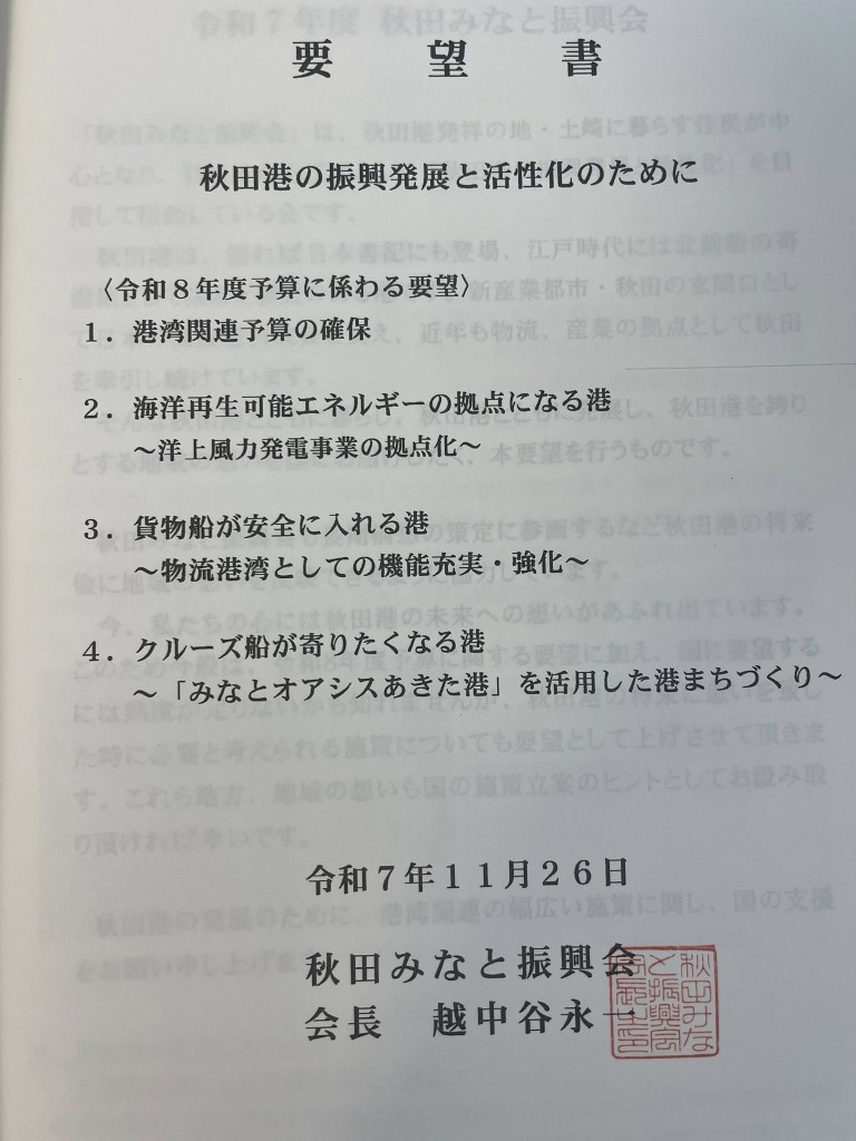 毎年恒例となった、秋田みなと振興会の越中谷会長をはじめ役員の皆さまとともに、国土交通省の安部港湾局長へ要望活動を行ってまいりました。